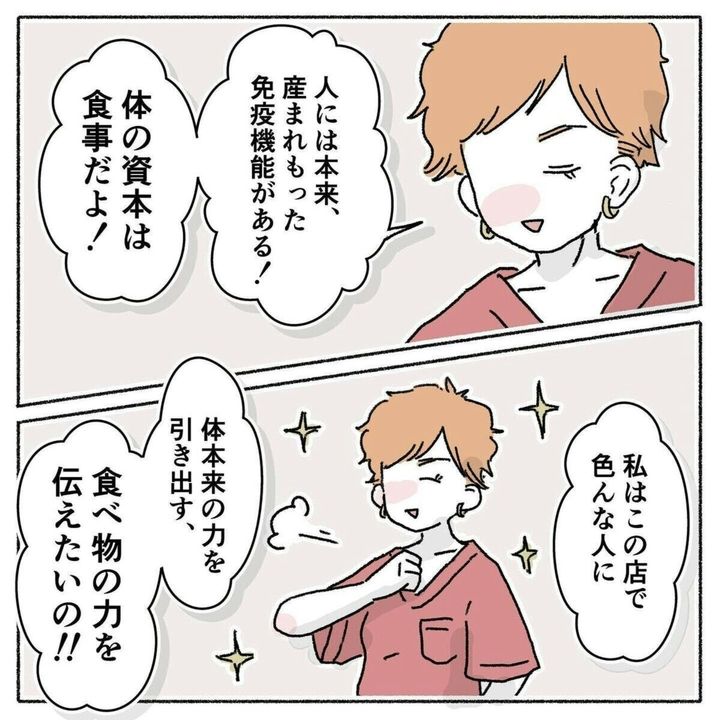 店のオーナー、タカヨはとても気さくな女性のようです。河野りぬさんも、久しぶりの会話を楽しんでいました。タカヨは、畑を借りて野菜を作ったり、添加物のない食品をわが子に与えたりと、食育に熱心。