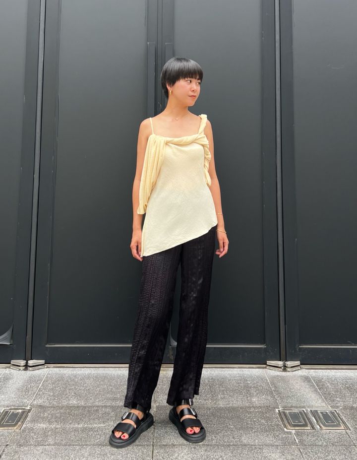 サンダル¥23,100(ドクターマーチン/Dr. Martens AirWair Japan)、H&M Studioのキャミソール、ヴィンテージのパンツ、TOMWOODのピアスは本人私物