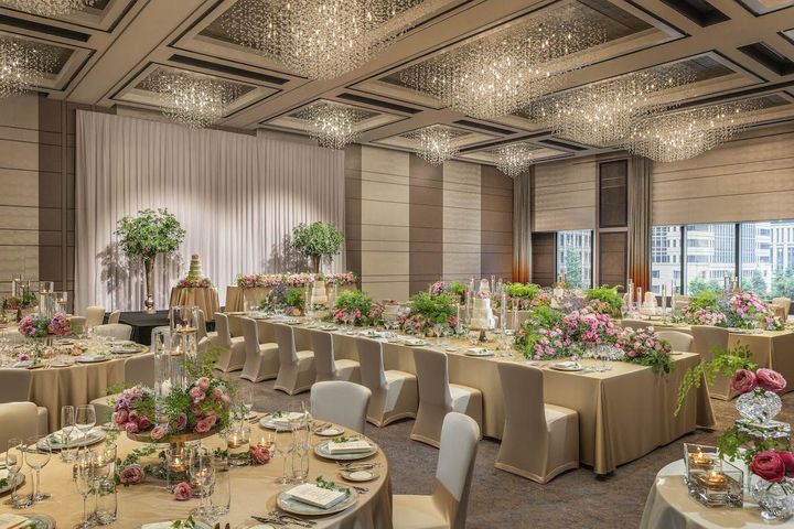 東京駅に隣接し、アクセスも抜群の「シャングリ・ラ 東京」。ワンフロアを借り切ることができるのはもちろん、専属のバトラーサービスなど一流ホテルならではのホスピタリティが魅力です。写真の会場「シャングリ・ラ ボールルーム」は、高さ約6mの天井にクリスタルのシャンデリアが輝く豪奢な空間。高層階からの眺めも楽しめるバンケットです。
