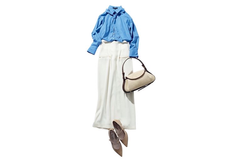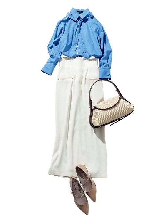 清潔感のある白×ブルーで涼しげに。クリーンな白タイトがコーデの女っぽさを加速。ブルーシャツに同色のボウタイをつけたら落ち着いた印象に仕上がります。