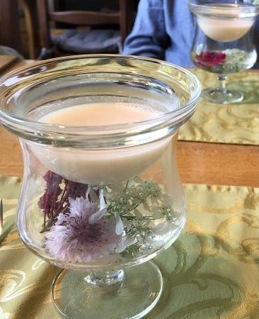 じゃがいもの温かいスープは、目にも心にもほっこり。優しいスープでした。お庭で育てたお花がかわいい。