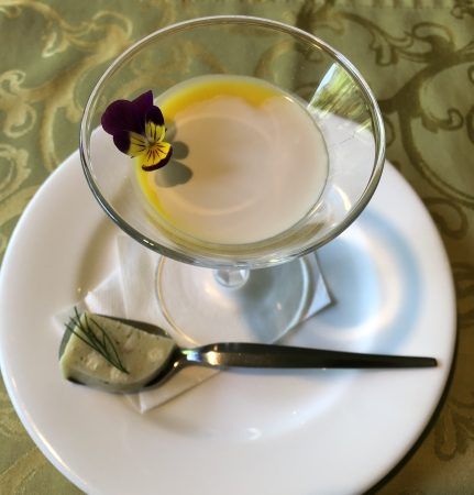まず、かぼちゃのムース&ディルがのったバジルのテリーヌ。かぼちゃのムースはふわふわ。テリーヌは、バジルの香りがいい感じ。ディルはお庭で朝摘んだものだそうです。ムースにあしらわれたすみれは、種から育てたそうですよ!