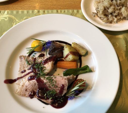 こちらは友達が頼んだ季節のプチコースのお肉料理、大崎豚の低温ロースト・ブルーベリーソース。しいたけ、じゃかいも、にんじん、トマト、ピーマンなどのお野菜が添えられています。