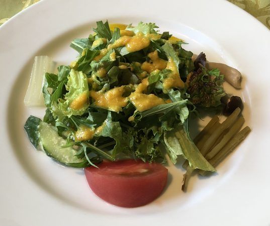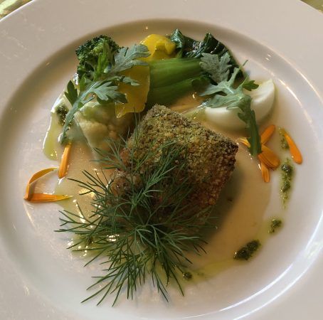 今日のお魚は、サワラの香草焼き、柚子のソースに朝摘みディル。かぶ、ブロッコリー、春菊などの野菜が付け合わせに。