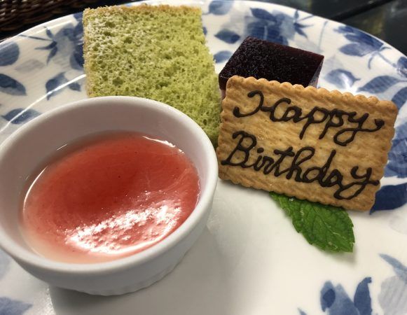 ルッコラのケーキ、パンナコッタ苺ソース、ブルーベリーケーキ。Happy Birthdayと書かれたビスケット、