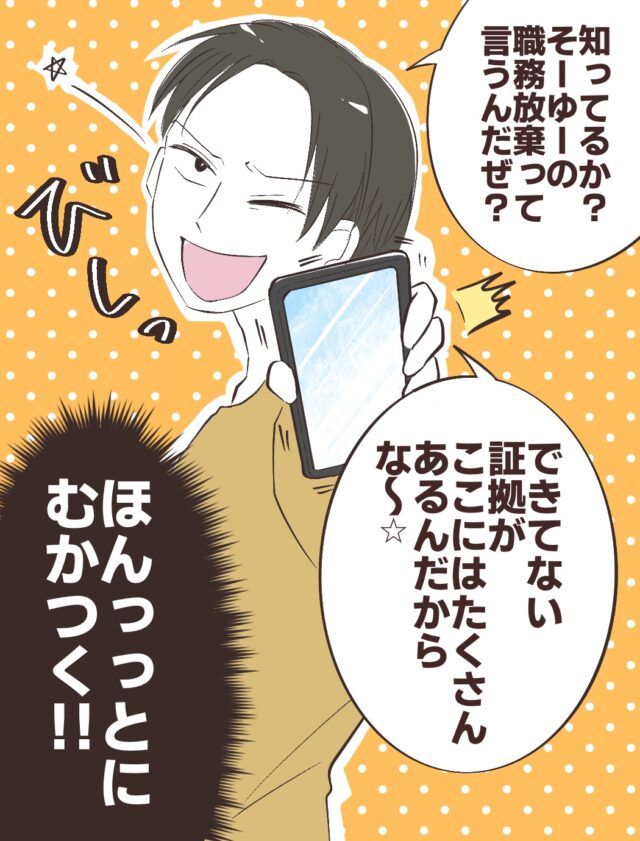 「知ってるか?職務放棄って言うんだぜ?」と意地悪くおどけて言うのでした。「できてない証拠がここにはたくさんあるんだからなー」とスマホを見せて笑うので、「ほんっっとにむかつく!!」と思いながらも怒りの持って行き場がありませんでした。