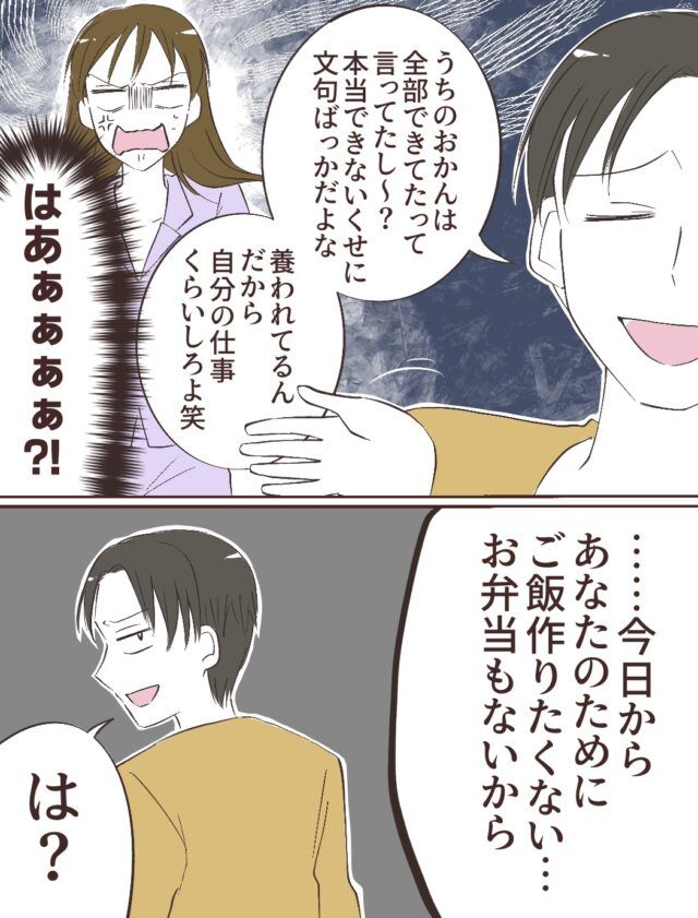 自分の母親は全部できていたという話を持ち出し、「養われてるんだから自分の仕事くらいしろよ?」と小ばかにしたように言ったことで、私の怒りは頂点に。もう夫のためにご飯を作りたくないと思えてきました。「お弁当もないから。」と言いました。
