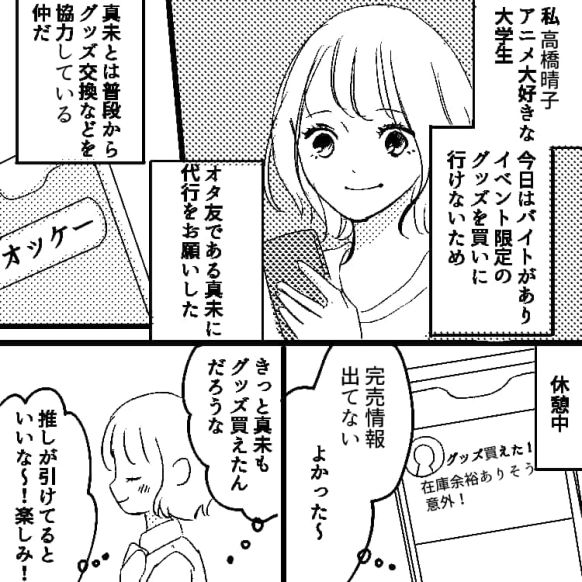 主人公はイベント限定のグッズが欲しかったのですが、生憎その日はバイトで行けないため、友だちの真未に代行をお願いしました。