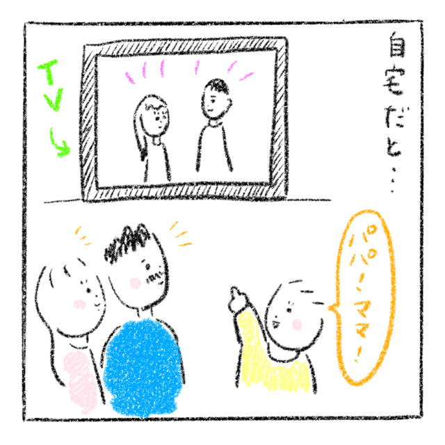 テレビを指差し「パパ!ママ!」と言う1歳娘。間違ってるけど、嬉しいから乗っかっちゃいます。|まもぺの育児漫画