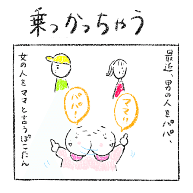 1歳の女の子ぽこたんのママであるまもぺさんから、乗っかってしまうことのお話です。最近のぽこたんは、男の人を見ると「パパ」、女の人を見ると「ママ」と言うそうなのですが、間違っているのにパパとママが「正解!」と言ってしまう時があるそうですよ?それはどんな時なのでしょうか。
