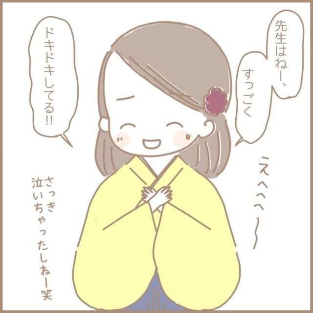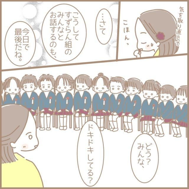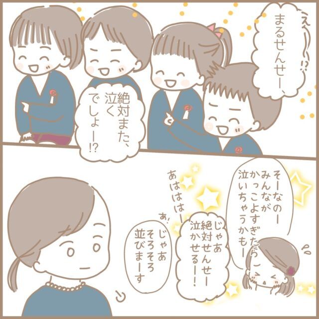 卒園式が始まる前から泣いてしまい、主任先生から呆れた様子で「しっかり涙腺しめときなさいよ!」と念を押されたまるちゃんさんは、気を取り直して教室で子ども達に最後のお話しをします。「みんなの名前を呼べる最後の日だから、心を込めて一生懸命呼ぶね」と緊張しながらも笑顔で話すまるちゃんさんに、子ども達から「先生絶対また泣くでしょー!?」と温かなツッコミが入りました。卒園式直前の教室ではこんな和やかなやり取りがされていたのですね!先生も子ども達のことを気遣っていますが、子ども達も先生を温かく見守ってくれているのですね!