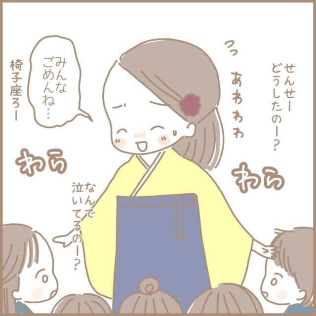 新卒1年目で年長クラスの担任になったまるちゃんさん。大きなプレッシャーや不安を感じながら、これまでたくさんの問題を子ども達と一緒に乗り越えてきました。いよいよ迎えた卒園式の日、卒園証書授与が終わるまでは絶対に泣いてはいけないと理事長から言われていたまるちゃんさんですが、式の直前に思いがけず保護者からの感謝の手紙を読んでしまい号泣してしまうのでした。