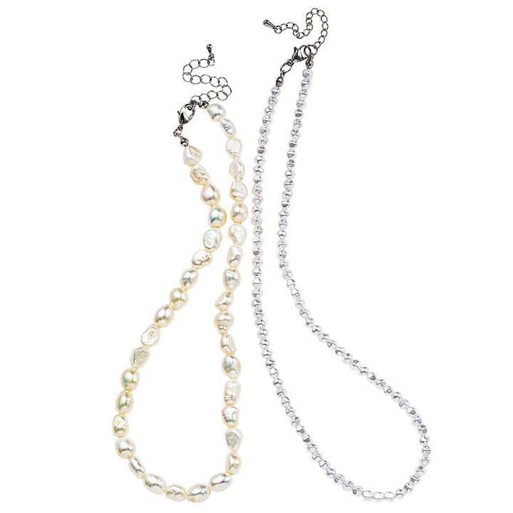 長さ違いのパールネックレスが2本セットに。小粒パールはアクリル素材で約40〜45cm、大粒パールは淡水パールで約35〜40cm。金具はシルバー色。