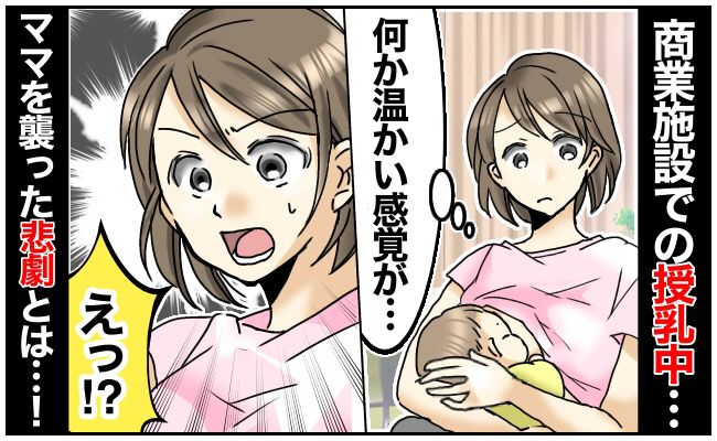 商業施設内の休憩所で子どもを縦抱きで授乳していたときのことです。授乳していると、私の太ももにツターッと温かい何かがつたうのを感じたのです。しかし、身動きが取れないので、私は気になりながらも、そのまま10分ほど授乳を続けたました。