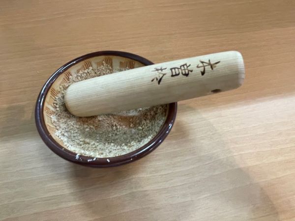 待っている間、ゴマをする課題が課せられました。 上司にゴマをするのは苦手でしたが、御馳走を前に下準備するゴマすりは大歓迎です。 課題の出来具合を見て、店員さんが特製ソースを注いでくれます。 サボっていると、特製ソースは注がれないようなので、しっかり頑張りましょう!