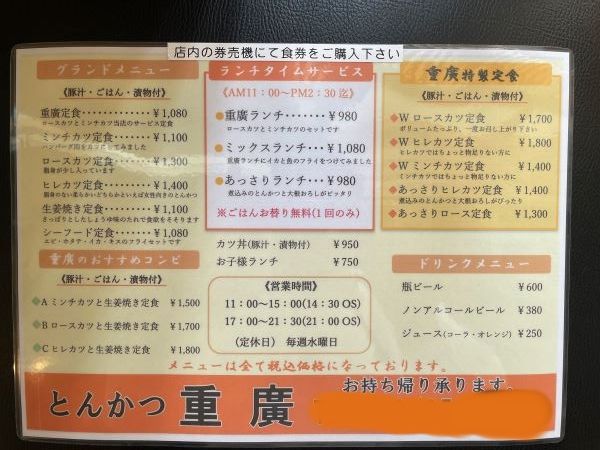 グランドメニューは、各種定食、増量した重廣特製定食、生姜焼きをセットにしたコンビ定食があります。 メニューをしばらく眺めていると、その法則が何となく分かってきます。 食いしん坊検定試験だと、1分以内で合格?の内容ですかね。