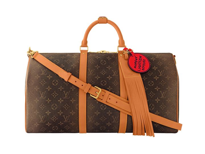 個性を添えるレッドの「Marque L.Vuitton Déposée」チャームと、フリンジ付きのレザーのネームタグはどこかウエスタンな雰囲気。大きめサイズのバッグこそ上質さで勝負して。