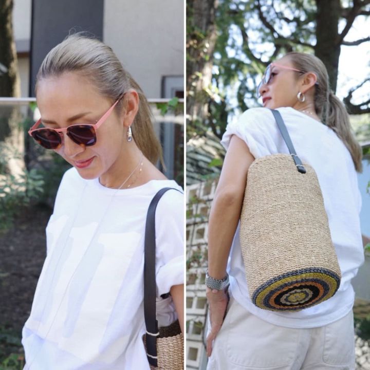 「チラリと見える底のカラーリングがポイントのカゴバッグは、縦長のフォルムでシャープな雰囲気に見えるのが特徴。ニットブランド、automills(オートミルズ)とのコラボです」バッグ¥24,200(ハブファン)、PINEのサングラスは本人私物
