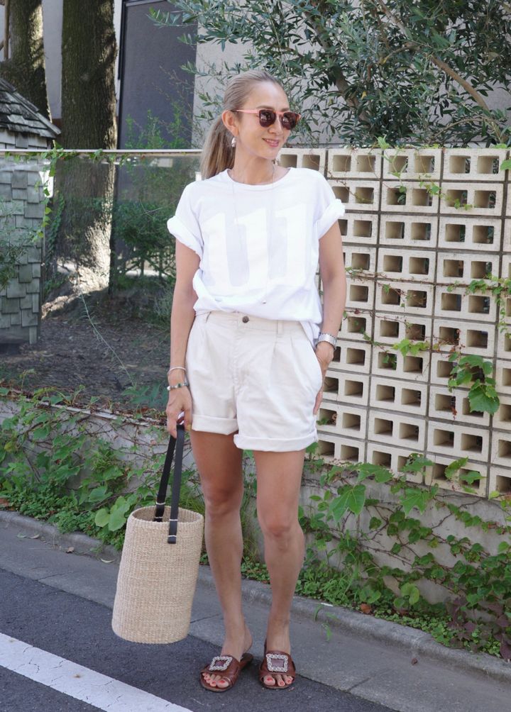 「暑いのでオールホワイトで爽やかにスタイリング。Tシャツ×ショーパンのシンプルなワンツーコーデなので、サングラスのピンクとバッグの底を差し色にプレイフルなムードに。この暑さで毎日腕か脚かどちらかを出していますが、この日は脚を出して涼し気な印象に仕上げました」