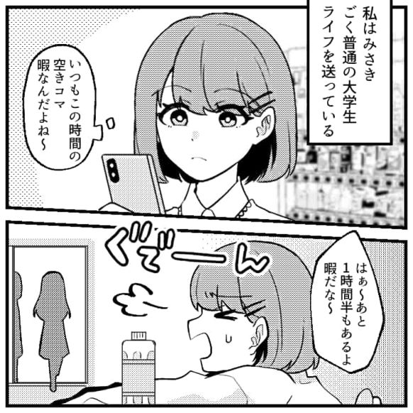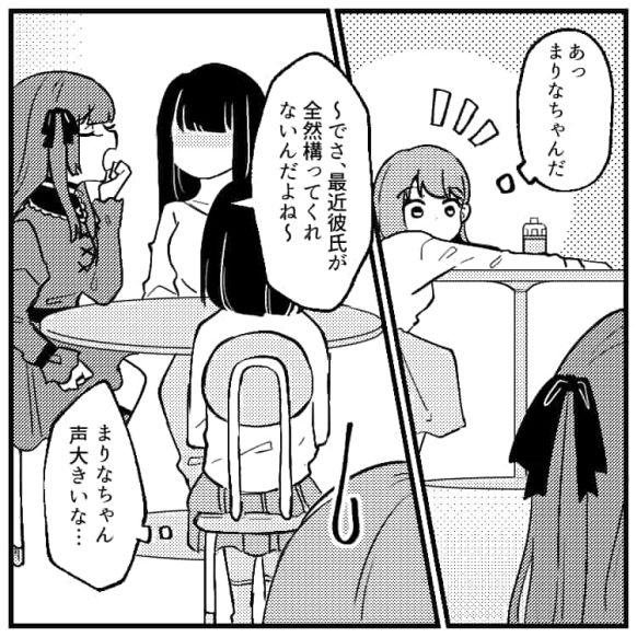 主人公は大学のフリースペースで暇を持て余していると、同じ学科の子・まりなちゃんを見かけます。