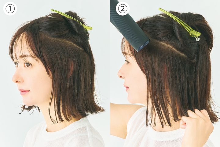 広がりやすい髪の内側。しっかりボリュームを抑えるためにまず最初にブロッキングするのが重要ポイント!こめかみの上から前上がりに髪を取り分けて、内側からスタイリングを。