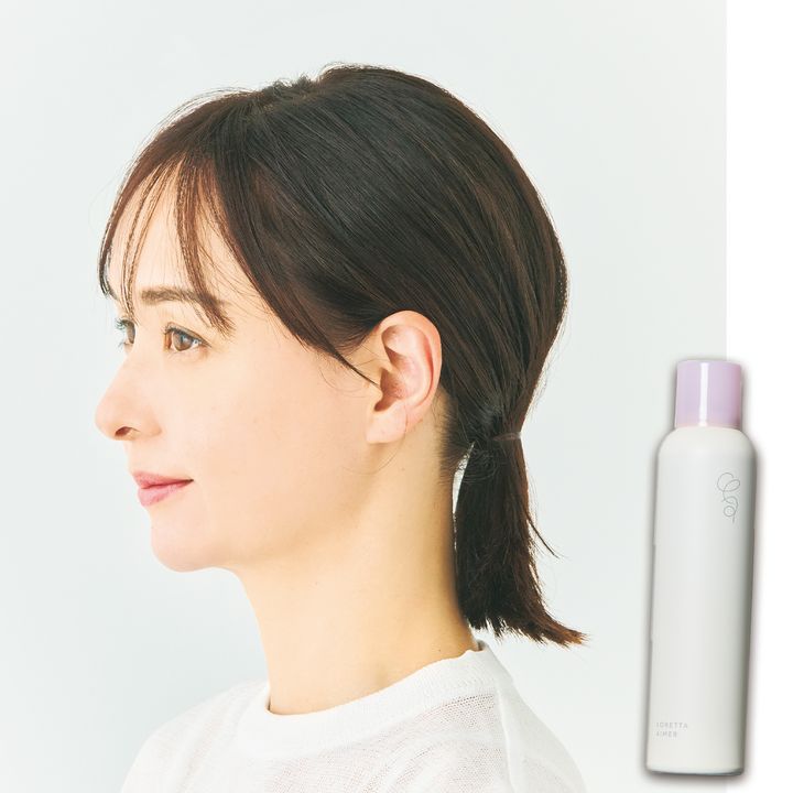アイテム:プロセス6でも使用。雨の日でも広がらない耐湿処方でツヤ髪が続く。ロレッタエメ グロスキープスプレー 170g ¥2,200(b-ex)