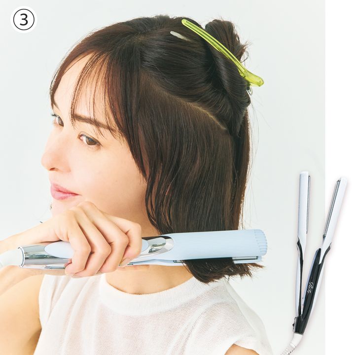 ストレートアイロンを根元から下に滑らせるようにあてながら、全体を外ハネにする。