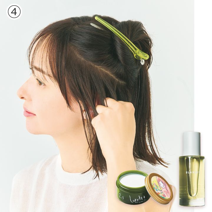 ⑤ブロッキングしていた外側の髪も1~4の工程を。さらに結ぶようにまとめながら表面にもワックスとオイルをなじませながら塗布。