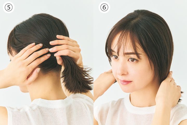 衿足が浮かないよう頭の丸みの下できつめに結んで10分ほどおく。ほどいたら6のようにグロススプレーをつければ朝の仕上がりに!