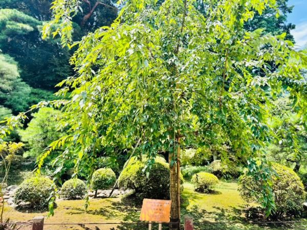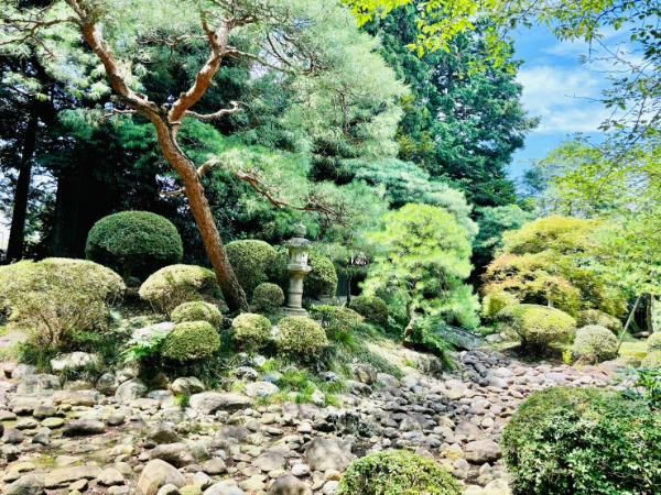 ここだけ体感温度が違った気がします。さわやかな気持ちでお散歩ができました。 境内に入ると、左手には緑が鮮やかな枯山水の庭園が見えてきます。
