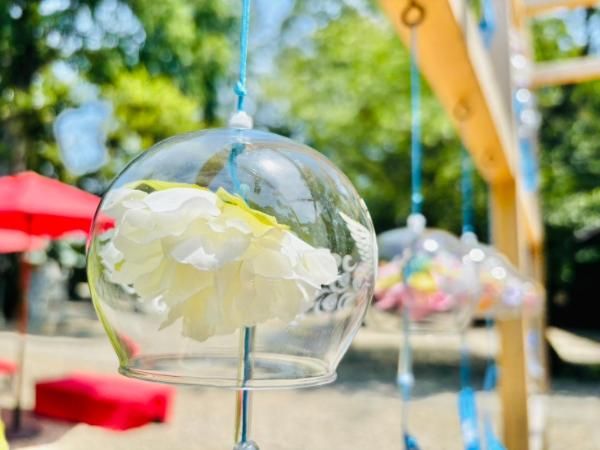 風鈴の中に色とりどりのお花が入っていて、風に揺れるその様は、とても涼やかです。