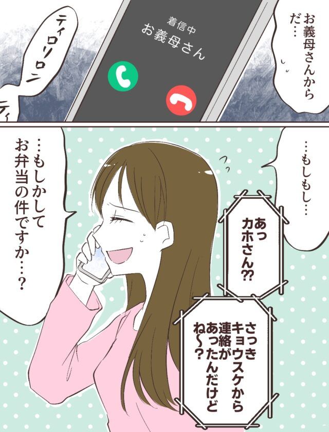 電話の主は義母だったのです。電話に出ると案の定「さっきキョウスケから連絡があったんだけどね」と言いかけたので、「もしかしてお弁当の件ですか?」とカホさんは自ら聞くしかありませんでした。
