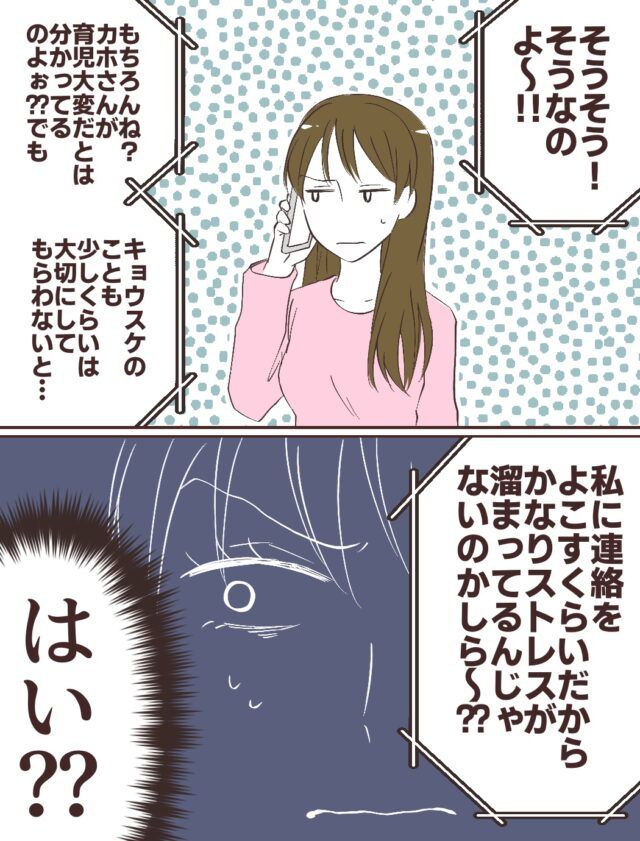 義母の話は、カホさんが育児が大変だとはわかっていると前置きしながらも、キョウスケさんのことを大切にしてほしいという内容でした。モヤモヤする気持ちをおさえて聞いていたカホさんでしたが、「私に連絡をよこすくらいだからかなりストレスがたまってるんじゃないのかしら?」という、息子の言葉を鵜呑みにしている義母の言葉にはカチンときてしまいました。