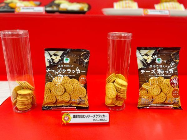 袋に入ったお菓子はなかなか増量が分かりにくいので、今回、会場には袋から全て出して並べて比較していました。まず、2週目に発売になるのが、「濃厚な味わいチーズクラッカー」です(168円)。