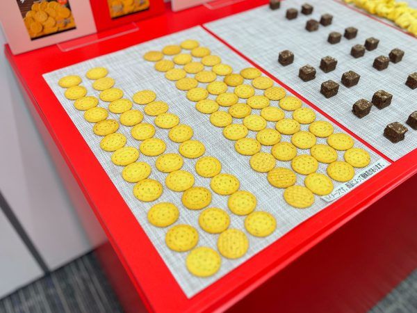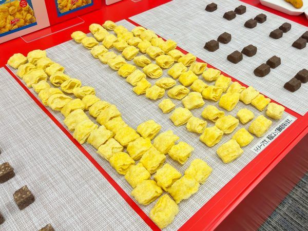 ブルーチーズ・チェダーチーズ・パルメザンチーズ・カマンベールチーズの4種のチーズパウダーを使用した1口サイズのクラッカーは、33万食限定販売です!比べると、1列分くらい多いですね。