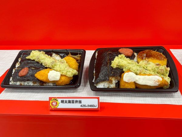 お弁当からは、「明太海苔弁当」が、全ての具材とごはんがそれぞれ「たぶん40%増量」。明太子・白身魚フライ・ちくわ磯辺天・コロッケなどがどどーんとのっていますよ(460円)。