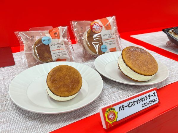 スイーツからは、こちらも大人気の「バタービスケットサンド チーズ」。発酵バター香るビスケットで、デンマーク産クリームチーズと北海道産マスカルポーネチーズを使用したバターチーズクリームをたっぷりサンド!厚さはもちろんのこと、大きさもだいぶ大きくなっていました(248円)。