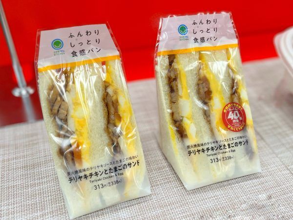 おいしさはそのままに1個増量した「テリヤキチキンとたまごのサンド」(338円)。炭火焼風味のテリヤキチキンに、たまごサラダ・ゆで卵を合わせた間違いない組み合わせです。