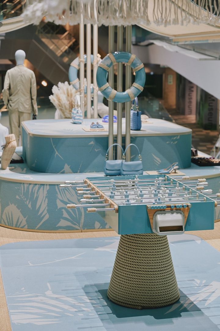 会場は、海や空を連想させるターコイズブルーを基調とした空間に、遊び心溢れるテーブルサッカー台や、サーフボードやマクラメ網のパラソルをはじめ、夏らしい織物のテクスチャーを用いた家具などの展示を通して、ジョルジオ アルマーニが提案するバカンスの世界観を楽しむことができる。
