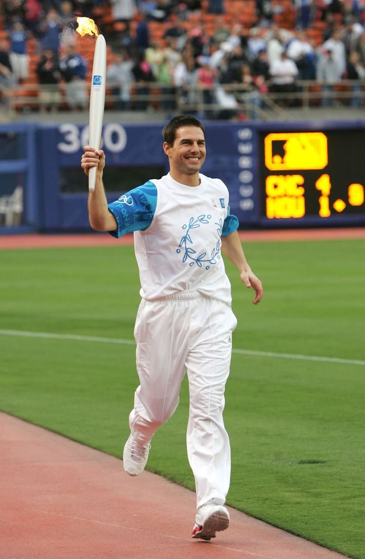 Tom Cruise enters Dodgers Stadium with the Olympic Torch during the torch relay on June 16, 2004 at Dodger Stadium in Los Angeles, California.
