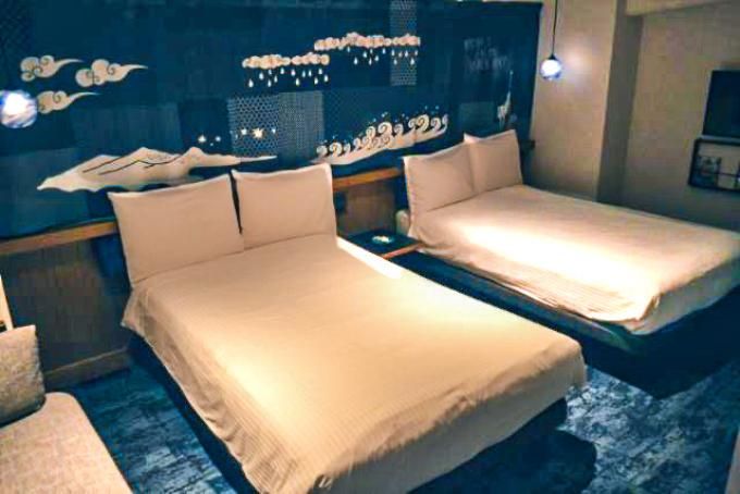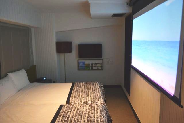 「シアターツイン」はSerta社製のワイド120cmのベッドが2台と、プロジェクターと84インチのスクリーンを完備した24平方メートルのコンセプトルーム。プロジェクターにはAndroid TVが搭載されているので、スマホやPCと繋いで好きなコンテンツを楽しんだり、最近では推しのアイドルのライブ映像を巨大スクリーンで見るなど、“推し活”目的で泊まったりする人も多いそうだ。
