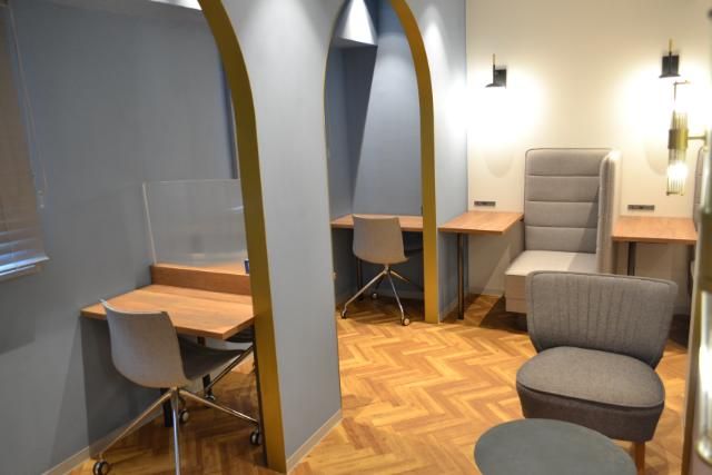 ホテル10階には宿泊者だけが利用できるワーキングラウンジがある。1席ずつ独立したワークデスクに、WEB会議用の個室ブースも備えつけてあり、Wi-Fiも完備。リモートワークやワーケーションを兼ねた滞在にもうってつけだ。