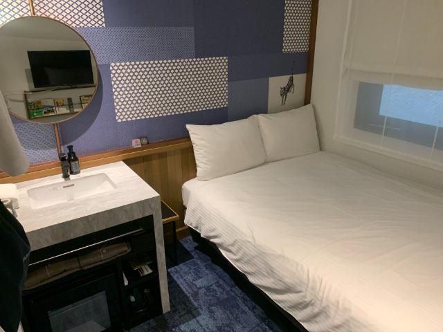 今回泊まったのは2020年にリニューアルされた「琉球モダンダブル」タイプ。140cmワイドのダブルベッドと、デスクのかわりに独立洗面台があるという珍しい設計だ。ルーム自体は12平方メートルとコンパクトだが、機能性と居住性を兼ね備えたコンパクトなつくりになっている。