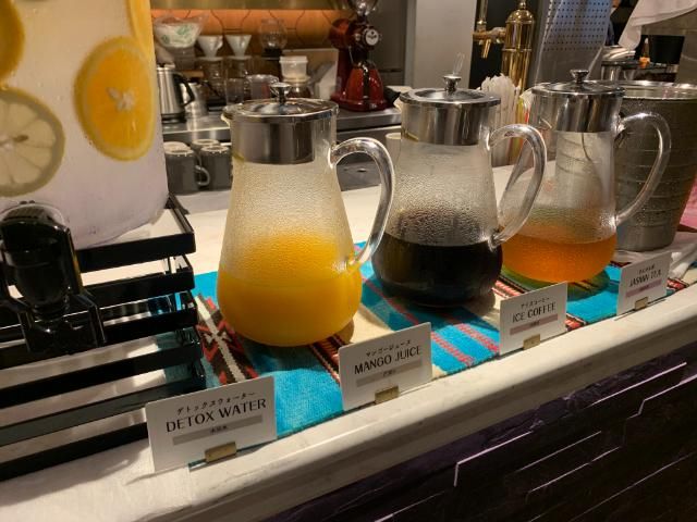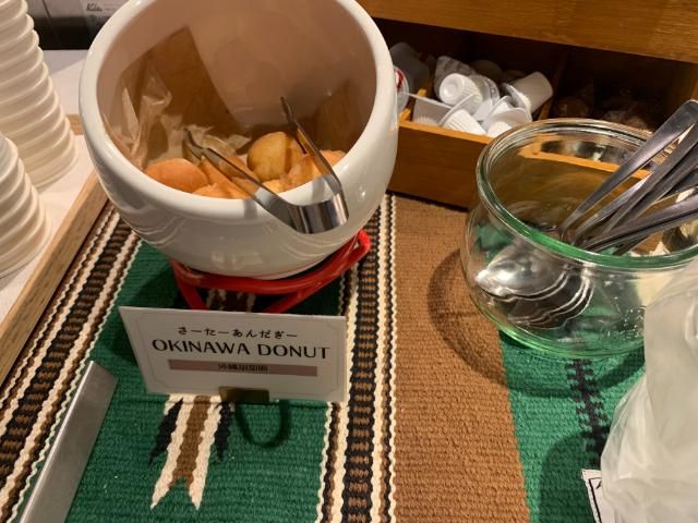 ドリンクコーナーには、さんぴん茶やマンゴージュース、冷温コーヒー、デトックスウォーター、牛乳がある。さらに、沖縄名物のサーターアンダギーも、一口サイズのものが食べ放題だ。