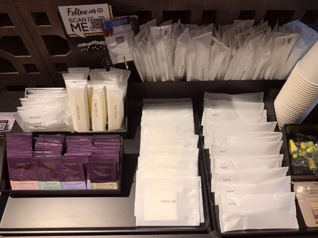フロントの後方にあるアメニティは、必要な分だけ部屋に持って帰るタイプだ。歯ブラシ、ヘアブラシ、シャワーキャップ、ひげそり、コットンセット、綿棒、耳栓、洗顔料、クレンジングジェル、化粧水、乳液など、男女とも身支度に必要なものはひと通りそろっている。