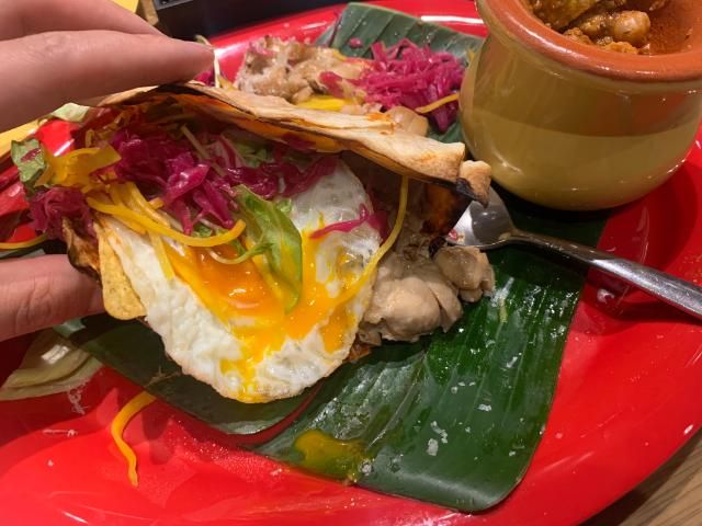今回は特別に4つとも食べさせてもらった。まずはウェボスランチェロス。メキシコで親しまれている定番の朝食で、「農場の卵料理」という意味があるらしい。まるでピザのようなトルティーヤに、目玉焼きと照り焼きチキン、そしてたっぷりの野菜がのっている。豪快に巻いて食らいつけば甘い照り焼きチキンの肉汁が、卵のまろやかさと相まって絶品!