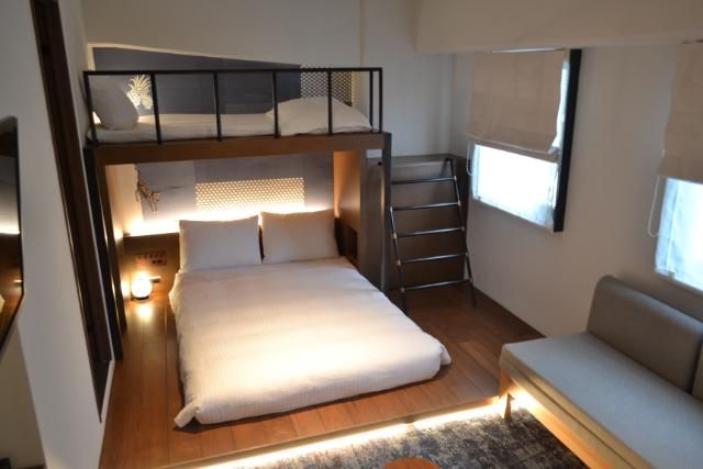 「琉球モダンロフト」はロフトベッド付きの24平方メートルのお部屋。140cmワイドのダブルベッドの上にロフトスペースがあり、幅90cmのマットレスが設置。独立トイレ、洗面台のついた脱衣室、 お風呂はバスタブ付き。家族や友人同士でワイワイしながら泊まれる。グループでの宿泊にもオススメだ。