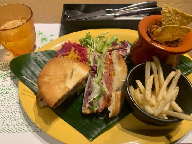 島サンドは、野菜をたっぷり挟んだメキシコ風のサンドイッチ。レタスやトマトの定番食材はもちろん、赤玉ねぎなどのちょっと変わった食材も使われていて、ランチョンミートや紅芋など沖縄食材もたっぷり入っている。ちょうどいい塩加減のフライドポテトもあって、ぺろりといけてしまった。