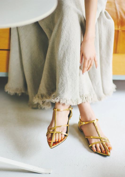 流行中のゴールドサンダル。肌なじみのいいシャイニー感がセンシュアルなオーラをプラス。ポインテッドトウでさらに女っぽく♡きらめくゴールドストラップで足元をヌーディに魅せて。