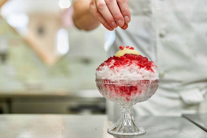 お店に並ぶかき氷は、およそ4種類。今回ご紹介するのはそのうち定番の「苺と薔薇」と「ルビーショコラ」。「食べる宝石」とでもよびたくなるような、赤色のグラデーションが美しいかき氷「苺と薔薇」。イチゴとバラに共通するのは、美しい赤。そして、どちらもバラ科の植物。だから食べた時に一体感が感じられるそう。
